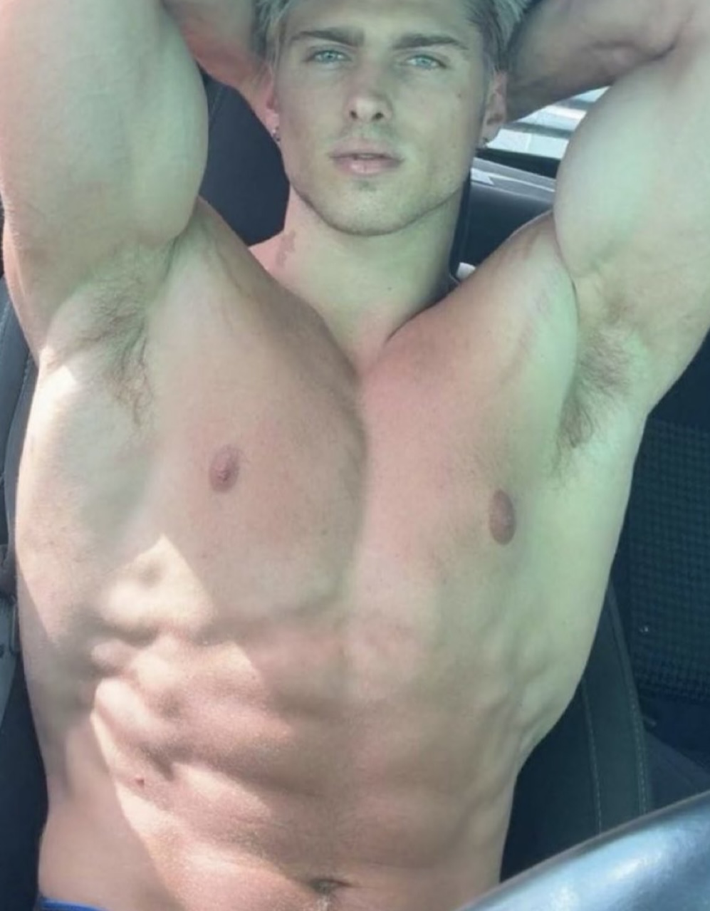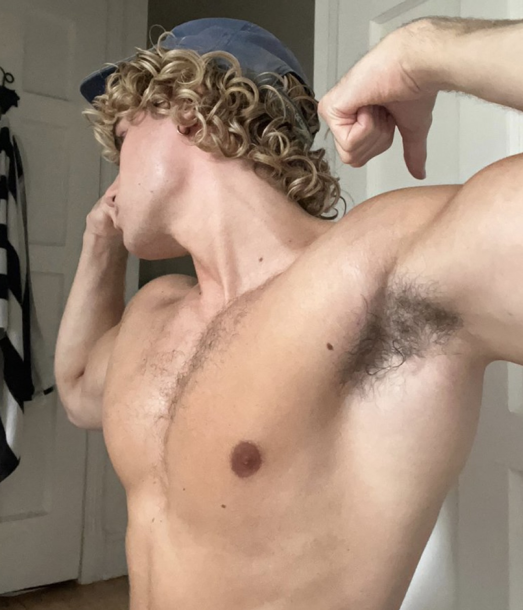 Samson’s eyes widened as he saw the Blonde Heel’s 52” smooth pecs and washboard abs rise above him. First, Phillip simply placed his hands behind his neck, showing off his muscular arms and dirty blonde armpit hair.