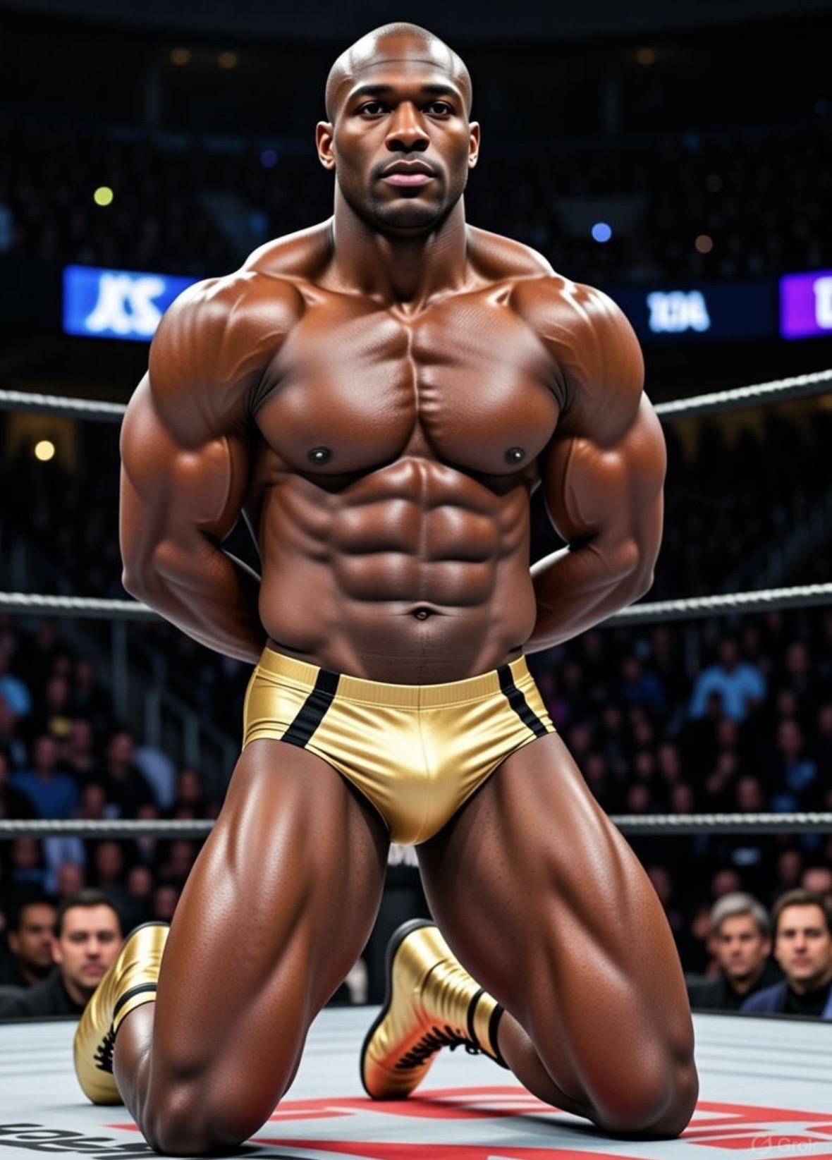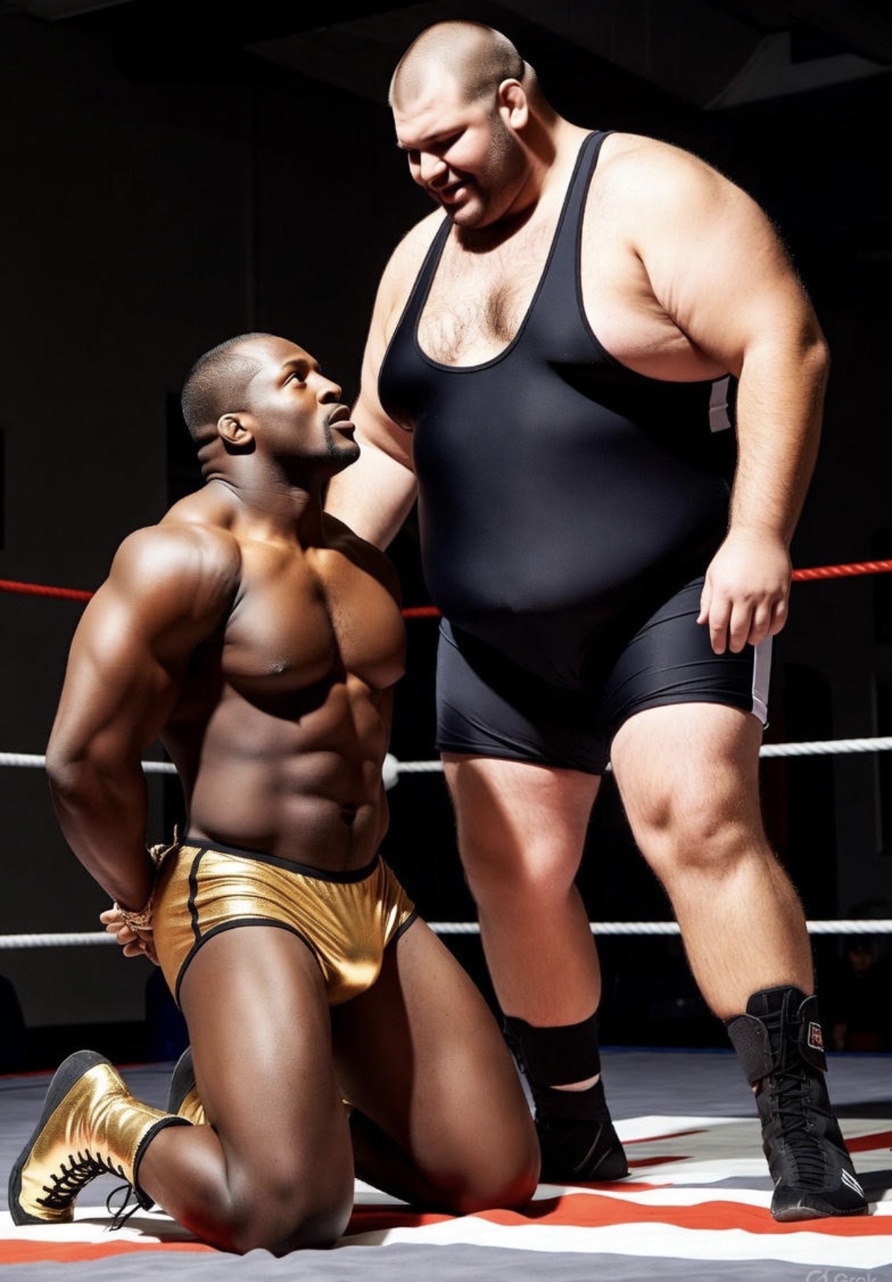 BlackAlpha was turned on by the sight of Masters’ muscular, golden body defeated and helpless in the corner. The Cocky Showboat was his toy boy now. He stared at Danny’s fat hog of a cock, which was becoming semi-hard between his legs. He could feel his own 9” cock strain against the bars of his cage.